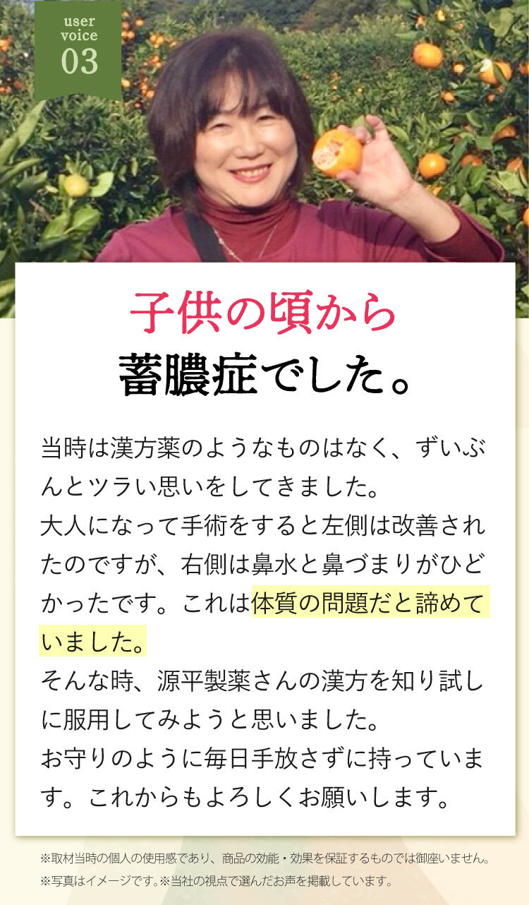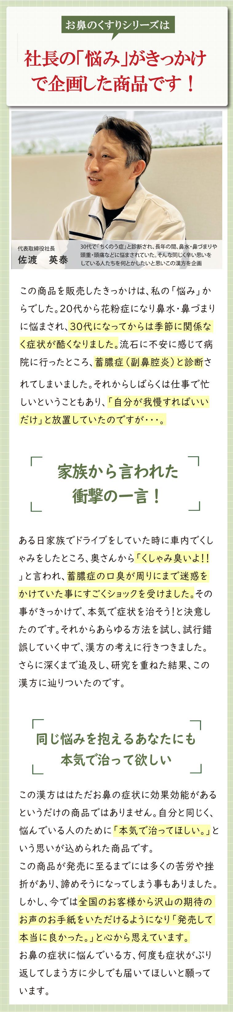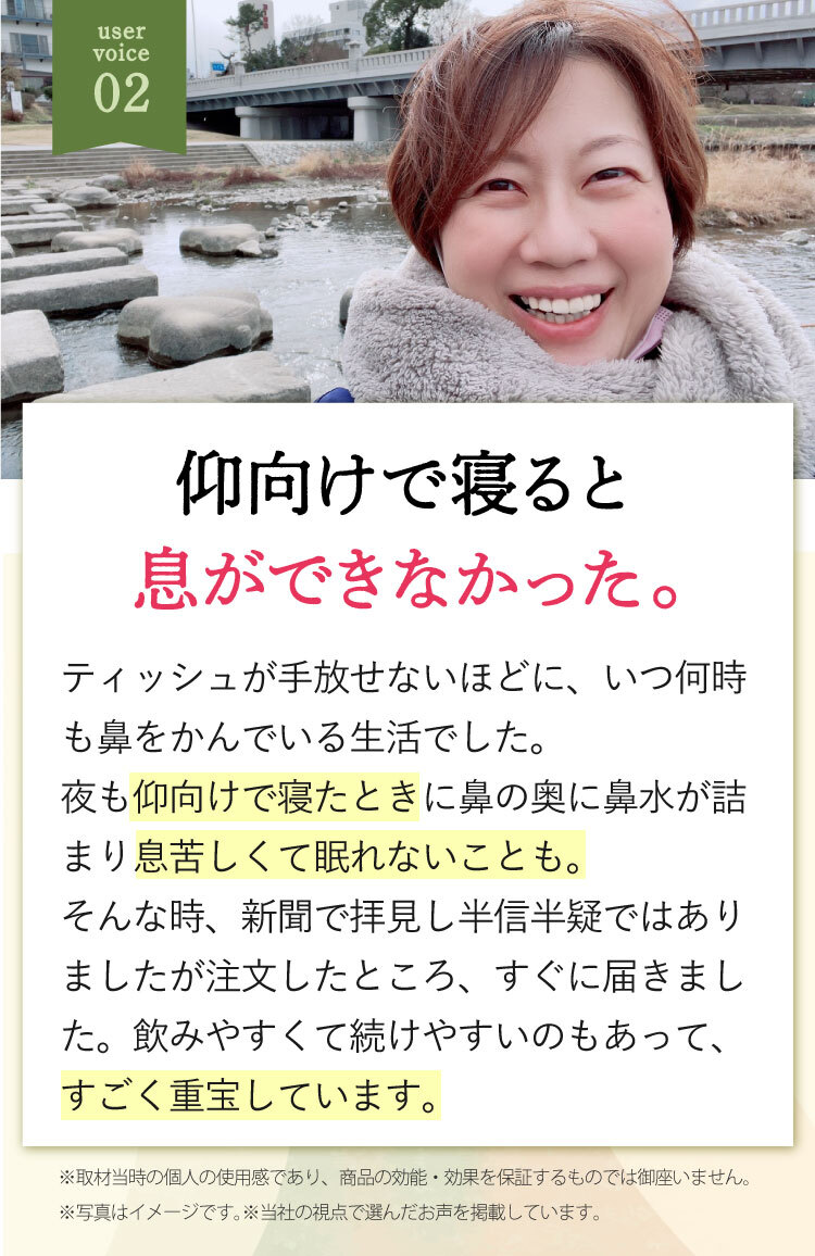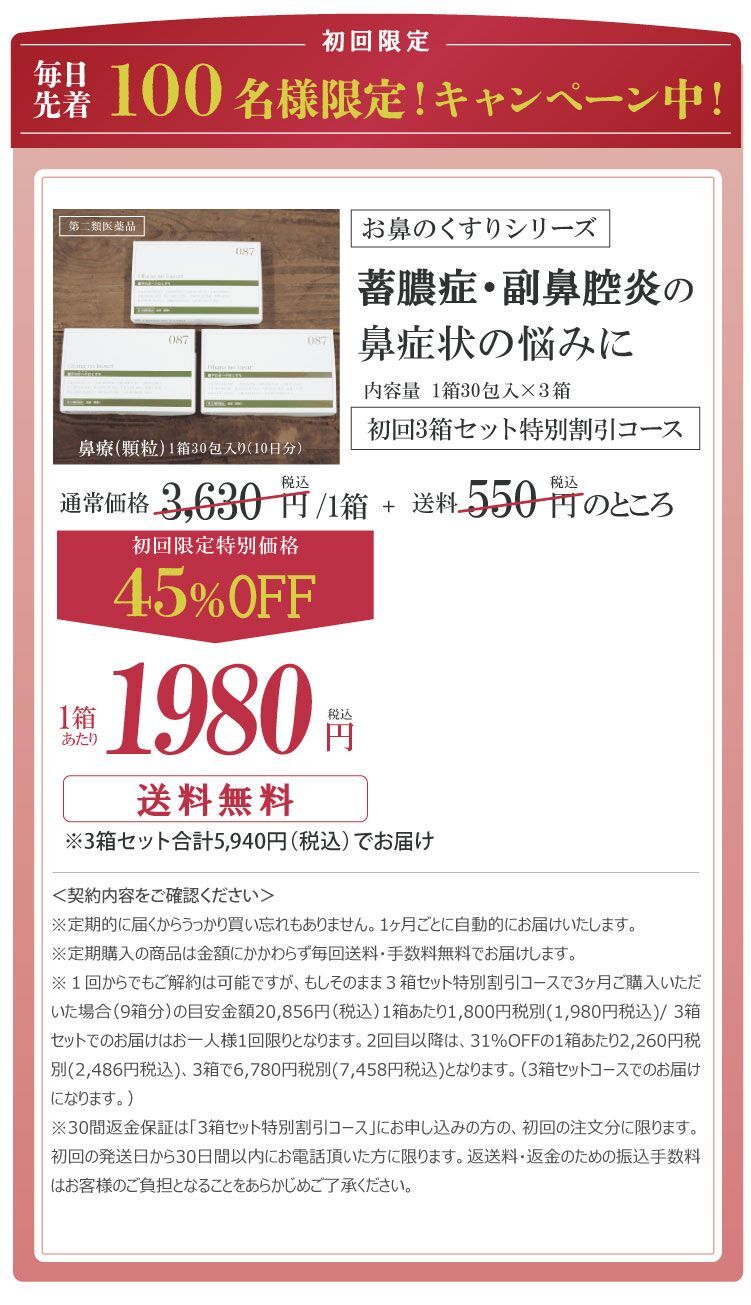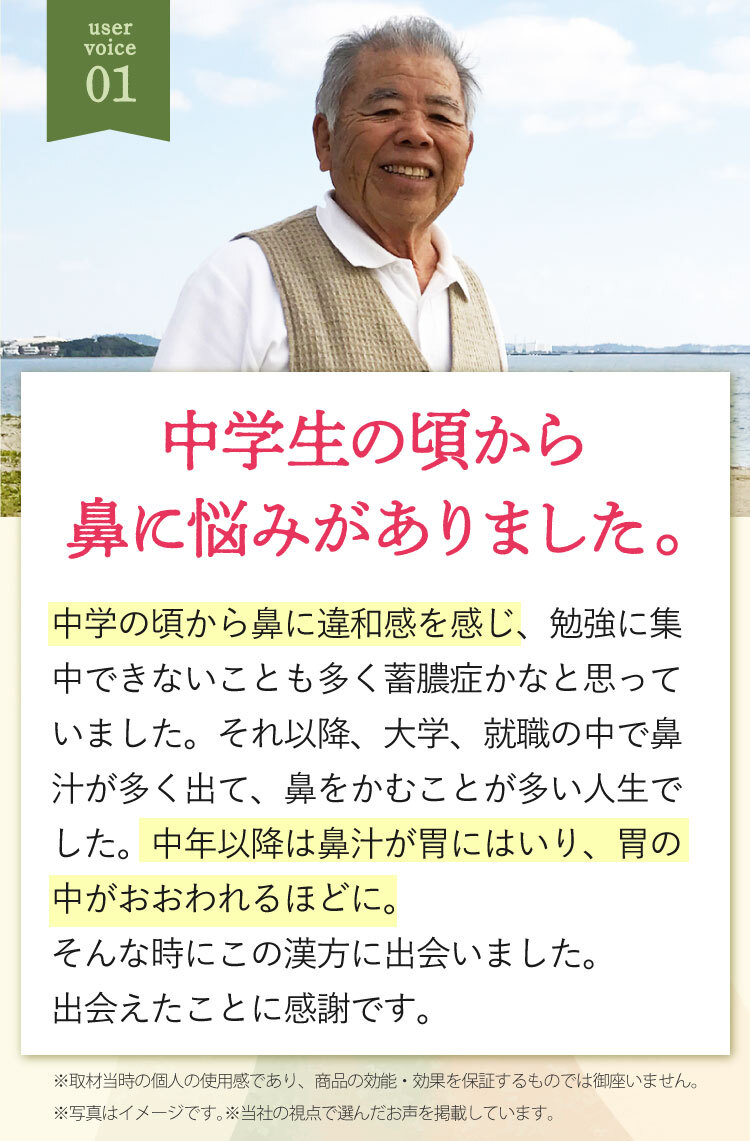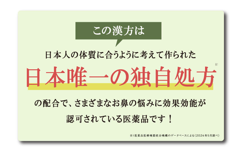 みなさまから頂くご質問、特別割引コースは1回目から解約可能ですか?はい、1回目からご解約いただけます。次回商品発送日の10日前までに解約の旨ご連絡ください。個数・コースの変更はできますか?いつでも変更いただけます。次回商品発送日の10日前までに変更内容をご連絡ください。本当に30日間返金保証してもらえるんですか?はい、大丈夫です。特別割引コースでご購入いただいたお客様が初回の発送日及び発行日を起点に30日以内に返金保証をご利用した場合、返金保証をご利用いただけます。初回以降の返品は受け付けていますか?商品の性質上、お客様のご都合による返品は原則的にお断りしています。商品到着時に必ず商品をご確認ください。・申し込まれた商品と届いた商品が異なっている場合・損傷している、汚れている商品上記に該当する場合は、無料で至急交換させていただきます。サプリメント、ハーブ・アロマ、民間療法との違いは?漢方薬は効能・効果が認められていて「改善すること」を目的としています。ハーブやアロマも一緒に考えがちですがそれらは民間療法の一つで、一定の基準における効果が証明されているものではなく、自由に利用するといったものです。また、蜂の子などの健康食品は、健康な状態を維持したり栄養を補給することを目的としています。目的に合わせ使い分けてご利用ください。漢方はずっと飲み続けないといけないのですか?いいえ、繰り返すお悩みの症状が改善されれば飲み続ける必要はありません。症状が改善し薬を飲まなくなった後でも、健康的な生活をご継続いただければ嬉しく思います。小学生ですが飲んでもいいのですか?はい、お飲みいただけます。お鼻のくすりは4歳以上の方から服用できます。但し、持病などをお持ちで他にお薬を飲んでいたりご心配な場合などありましたら、弊社医薬品相談窓口までご相談ください。急な鼻詰まりが起きたときに飲んでもいいですか?漢方薬の多くは慢性の症状に向けたものです。その場しのぎではなく、じっくりとお使いいただくお薬ですので、急に症状が出た時にのみお飲みいただくのではなく、用法用量を守って毎日服用いただければと思います。副作用はありませんか?まれに、以下のような症状があらわれる場合があります。皮膚の発疹・発赤・かゆみ・消化器の食欲不振・胃部不快感、このような症状が出た場合にはいったん服用をお止めいただき、弊社医薬品相談窓口、またはかかりつけの医師にご相談ください。もともと胃の弱い方は、少量で様子を見ながら始めたほうが良い場合などもあります。そのため、服用前には必ず添付文書をお読みください。鼻詰まりの症状が一時的なものですが、飲んで大丈夫ですか?はい、お飲みいただいて大丈夫です。その他にも服用の際にご心配なことがございましたら弊社医薬品相談窓口へお気軽にご相談ください。フリマサイトで見かけたのですが、そちらで購入してもいいですか?こちらは医薬品です。医薬品を販売するには、医薬品販売業の許可が必要で、許可なく医薬品をフリマサイト等で販売することは、医薬品医療機器等法に違反します。その旨理解されていない方が転売している可能性がありますので、購入しないようお願い致します。購入の際は、こちらの公式ページからのお申込み・フリーダイヤルよりお待ちしております。