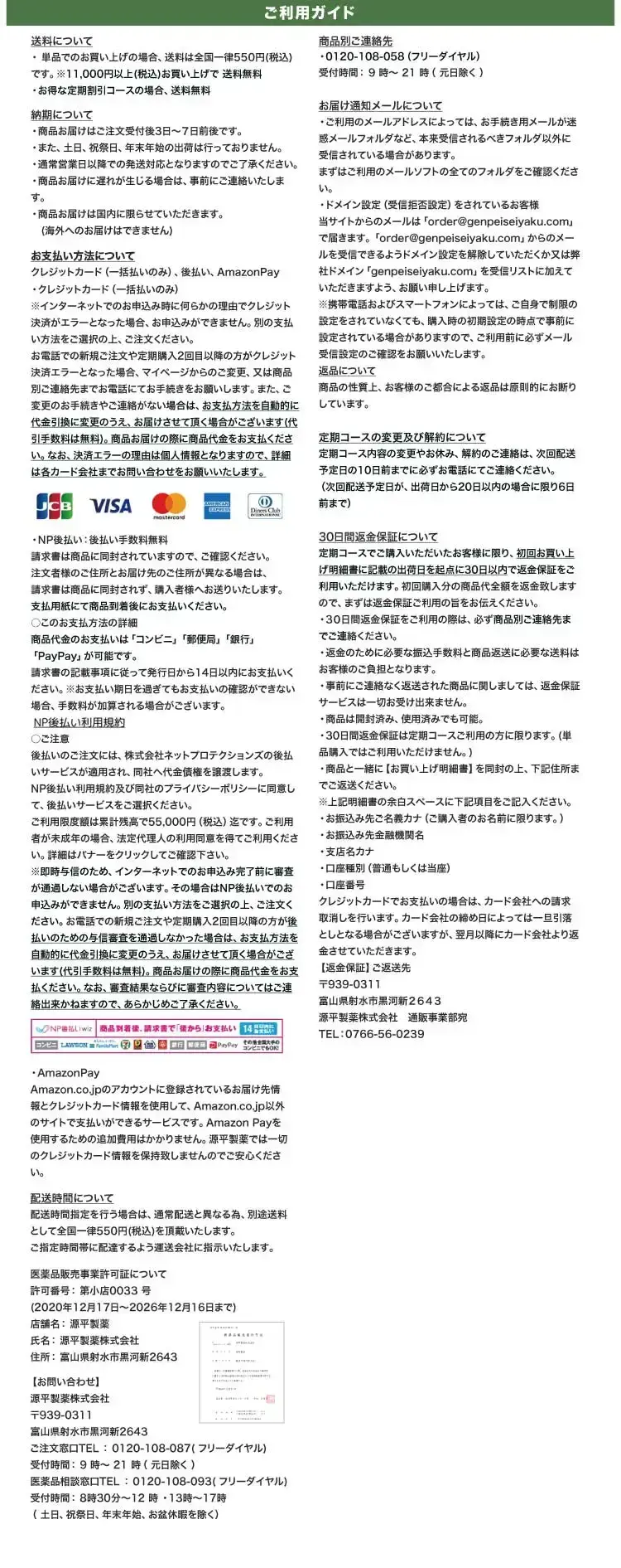 みなさまから頂くご質問、特別割引コースは1回目から解約可能ですか?はい、1回目からご解約いただけます。次回商品発送日の10日前までに解約の旨ご連絡ください。個数・コースの変更はできますか?いつでも変更いただけます。次回商品発送日の10日前までに変更内容をご連絡ください。本当に30日間返金保証してもらえるんですか?はい、大丈夫です。特別割引コースでご購入いただいたお客様が初回の発送日及び発行日を起点に30日以内に返金保証をご利用した場合、返金保証をご利用いただけます。初回以降の返品は受け付けていますか?商品の性質上、お客様のご都合による返品は原則的にお断りしています。商品到着時に必ず商品をご確認ください。・申し込まれた商品と届いた商品が異なっている場合・損傷している、汚れている商品上記に該当する場合は、無料で至急交換させていただきます。サプリメント、ハーブ・アロマ、民間療法との違いは?漢方薬は効能・効果が認められていて「改善すること」を目的としています。ハーブやアロマも一緒に考えがちですがそれらは民間療法の一つで、一定の基準における効果が証明されているものではなく、自由に利用するといったものです。また、蜂の子などの健康食品は、健康な状態を維持したり栄養を補給することを目的としています。目的に合わせ使い分けてご利用ください。漢方はずっと飲み続けないといけないのですか?いいえ、繰り返すお悩みの症状が改善されれば飲み続ける必要はありません。症状が改善し薬を飲まなくなった後でも、健康的な生活をご継続いただければ嬉しく思います。小学生ですが飲んでもいいのですか?はい、お飲みいただけます。お鼻のくすりは4歳以上の方から服用できます。但し、持病などをお持ちで他にお薬を飲んでいたりご心配な場合などありましたら、弊社医薬品相談窓口までご相談ください。急な鼻詰まりが起きたときに飲んでもいいですか?漢方薬の多くは慢性の症状に向けたものです。その場しのぎではなく、じっくりとお使いいただくお薬ですので、急に症状が出た時にのみお飲みいただくのではなく、用法用量を守って毎日服用いただければと思います。副作用はありませんか?まれに、以下のような症状があらわれる場合があります。皮膚の発疹・発赤・かゆみ・消化器の食欲不振・胃部不快感、このような症状が出た場合にはいったん服用をお止めいただき、弊社医薬品相談窓口、またはかかりつけの医師にご相談ください。もともと胃の弱い方は、少量で様子を見ながら始めたほうが良い場合などもあります。そのため、服用前には必ず添付文書をお読みください。鼻詰まりの症状が一時的なものですが、飲んで大丈夫ですか?はい、お飲みいただいて大丈夫です。その他にも服用の際にご心配なことがございましたら弊社医薬品相談窓口へお気軽にご相談ください。フリマサイトで見かけたのですが、そちらで購入してもいいですか?こちらは医薬品です。医薬品を販売するには、医薬品販売業の許可が必要で、許可なく医薬品をフリマサイト等で販売することは、医薬品医療機器等法に違反します。その旨理解されていない方が転売している可能性がありますので、購入しないようお願い致します。購入の際は、こちらの公式ページからのお申込み・フリーダイヤルよりお待ちしております。