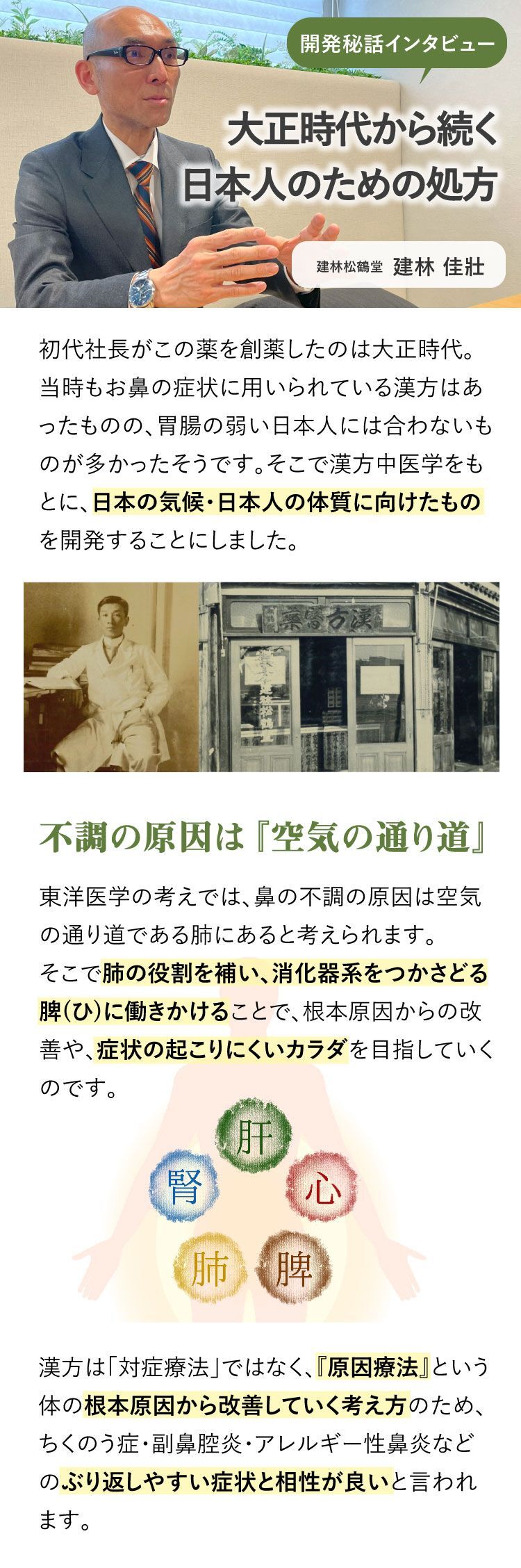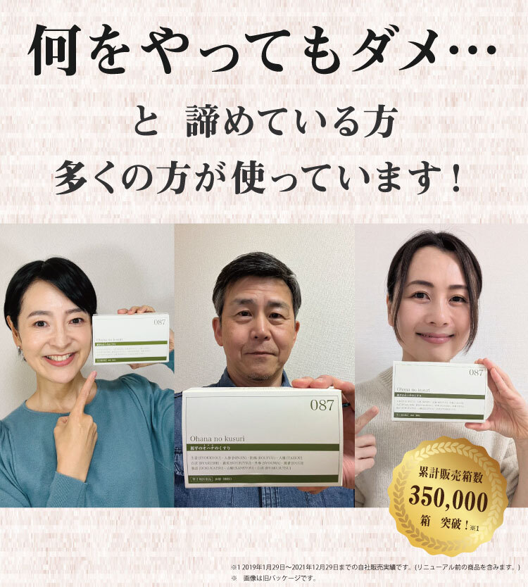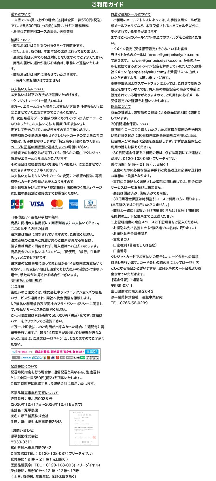 みなさまから頂くご質問、特別割引コースは1回目から解約可能ですか?はい、1回目からご解約いただけます。次回商品発送日の10日前までに解約の旨ご連絡ください。個数・コースの変更はできますか?いつでも変更いただけます。次回商品発送日の10日前までに変更内容をご連絡ください。本当に30日間返金保証してもらえるんですか?はい、大丈夫です。特別割引コースでご購入いただいたお客様が初回の発送日及び発行日を起点に30日以内に返金保証をご利用した場合、返金保証をご利用いただけます。初回以降の返品は受け付けていますか?商品の性質上、お客様のご都合による返品は原則的にお断りしています。商品到着時に必ず商品をご確認ください。・申し込まれた商品と届いた商品が異なっている場合・損傷している、汚れている商品上記に該当する場合は、無料で至急交換させていただきます。サプリメント、ハーブ・アロマ、民間療法との違いは?漢方薬は効能・効果が認められていて「改善すること」を目的としています。ハーブやアロマも一緒に考えがちですがそれらは民間療法の一つで、一定の基準における効果が証明されているものではなく、自由に利用するといったものです。また、蜂の子などの健康食品は、健康な状態を維持したり栄養を補給することを目的としています。目的に合わせ使い分けてご利用ください。漢方はずっと飲み続けないといけないのですか?いいえ、繰り返すお悩みの症状が改善されれば飲み続ける必要はありません。症状が改善し薬を飲まなくなった後でも、健康的な生活をご継続いただければ嬉しく思います。小学生ですが飲んでもいいのですか?はい、お飲みいただけます。お鼻のくすりは4歳以上の方から服用できます。但し、持病などをお持ちで他にお薬を飲んでいたりご心配な場合などありましたら、弊社医薬品相談窓口までご相談ください。急な鼻詰まりが起きたときに飲んでもいいですか?漢方薬の多くは慢性の症状に向けたものです。その場しのぎではなく、じっくりとお使いいただくお薬ですので、急に症状が出た時にのみお飲みいただくのではなく、用法用量を守って毎日服用いただければと思います。副作用はありませんか?まれに、以下のような症状があらわれる場合があります。皮膚の発疹・発赤・かゆみ・消化器の食欲不振・胃部不快感、このような症状が出た場合にはいったん服用をお止めいただき、弊社医薬品相談窓口、またはかかりつけの医師にご相談ください。もともと胃の弱い方は、少量で様子を見ながら始めたほうが良い場合などもあります。そのため、服用前には必ず添付文書をお読みください。鼻詰まりの症状が一時的なものですが、飲んで大丈夫ですか?はい、お飲みいただいて大丈夫です。その他にも服用の際にご心配なことがございましたら弊社医薬品相談窓口へお気軽にご相談ください。フリマサイトで見かけたのですが、そちらで購入してもいいですか?こちらは医薬品です。医薬品を販売するには、医薬品販売業の許可が必要で、許可なく医薬品をフリマサイト等で販売することは、医薬品医療機器等法に違反します。その旨理解されていない方が転売している可能性がありますので、購入しないようお願い致します。購入の際は、こちらの公式ページからのお申込み・フリーダイヤルよりお待ちしております。