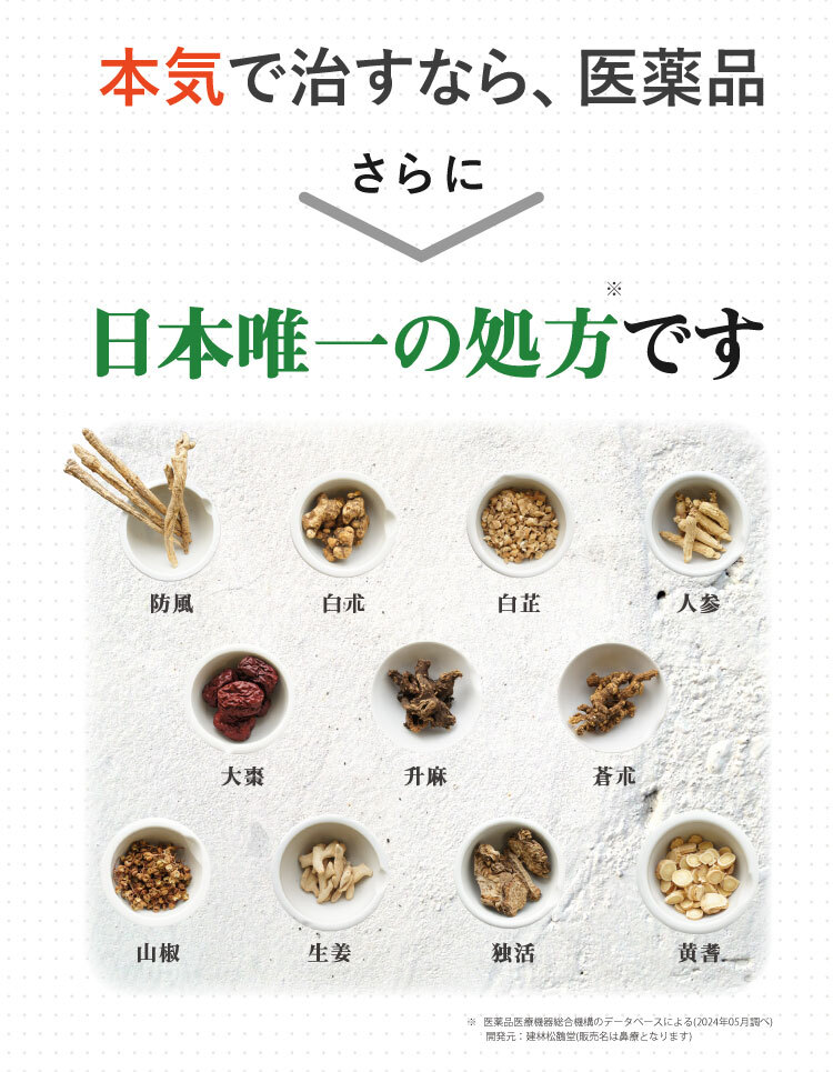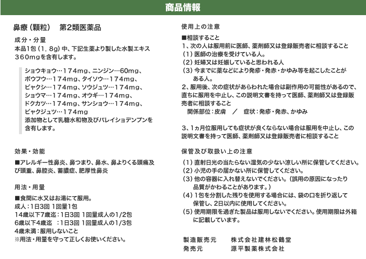 みなさまから頂くご質問、特別割引コースは1回目から解約可能ですか?はい、1回目からご解約いただけます。次回商品発送日の10日前までに解約の旨ご連絡ください。個数・コースの変更はできますか?いつでも変更いただけます。次回商品発送日の10日前までに変更内容をご連絡ください。本当に30日間返金保証してもらえるんですか?はい、大丈夫です。特別割引コースでご購入いただいたお客様が初回の発送日及び発行日を起点に30日以内に返金保証をご利用した場合、返金保証をご利用いただけます。初回以降の返品は受け付けていますか?商品の性質上、お客様のご都合による返品は原則的にお断りしています。商品到着時に必ず商品をご確認ください。・申し込まれた商品と届いた商品が異なっている場合・損傷している、汚れている商品上記に該当する場合は、無料で至急交換させていただきます。サプリメント、ハーブ・アロマ、民間療法との違いは?漢方薬は効能・効果が認められていて「改善すること」を目的としています。ハーブやアロマも一緒に考えがちですがそれらは民間療法の一つで、一定の基準における効果が証明されているものではなく、自由に利用するといったものです。また、蜂の子などの健康食品は、健康な状態を維持したり栄養を補給することを目的としています。目的に合わせ使い分けてご利用ください。漢方はずっと飲み続けないといけないのですか?いいえ、繰り返すお悩みの症状が改善されれば飲み続ける必要はありません。症状が改善し薬を飲まなくなった後でも、健康的な生活をご継続いただければ嬉しく思います。小学生ですが飲んでもいいのですか?はい、お飲みいただけます。お鼻のくすりは4歳以上の方から服用できます。但し、持病などをお持ちで他にお薬を飲んでいたりご心配な場合などありましたら、弊社医薬品相談窓口までご相談ください。急な鼻詰まりが起きたときに飲んでもいいですか?漢方薬の多くは慢性の症状に向けたものです。その場しのぎではなく、じっくりとお使いいただくお薬ですので、急に症状が出た時にのみお飲みいただくのではなく、用法用量を守って毎日服用いただければと思います。副作用はありませんか?まれに、以下のような症状があらわれる場合があります。皮膚の発疹・発赤・かゆみ・消化器の食欲不振・胃部不快感、このような症状が出た場合にはいったん服用をお止めいただき、弊社医薬品相談窓口、またはかかりつけの医師にご相談ください。もともと胃の弱い方は、少量で様子を見ながら始めたほうが良い場合などもあります。そのため、服用前には必ず添付文書をお読みください。鼻詰まりの症状が一時的なものですが、飲んで大丈夫ですか?はい、お飲みいただいて大丈夫です。その他にも服用の際にご心配なことがございましたら弊社医薬品相談窓口へお気軽にご相談ください。フリマサイトで見かけたのですが、そちらで購入してもいいですか?こちらは医薬品です。医薬品を販売するには、医薬品販売業の許可が必要で、許可なく医薬品をフリマサイト等で販売することは、医薬品医療機器等法に違反します。その旨理解されていない方が転売している可能性がありますので、購入しないようお願い致します。購入の際は、こちらの公式ページからのお申込み・フリーダイヤルよりお待ちしております。