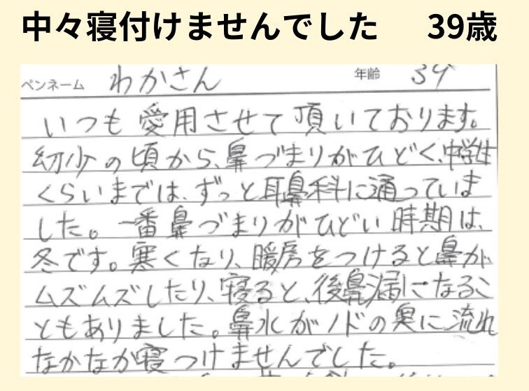 長年鼻水が喉にはりついたような不快な思いをしてきました。病院を変えても大体同じ薬を処方され、一時的に良くなるもののくり返し同じ症状になり、精神的にも落ち込んでしまい日常が憂鬱でした。そんな時に母がたまたま見た新聞広告でこの薬を知り、光が差したような気持ちです!